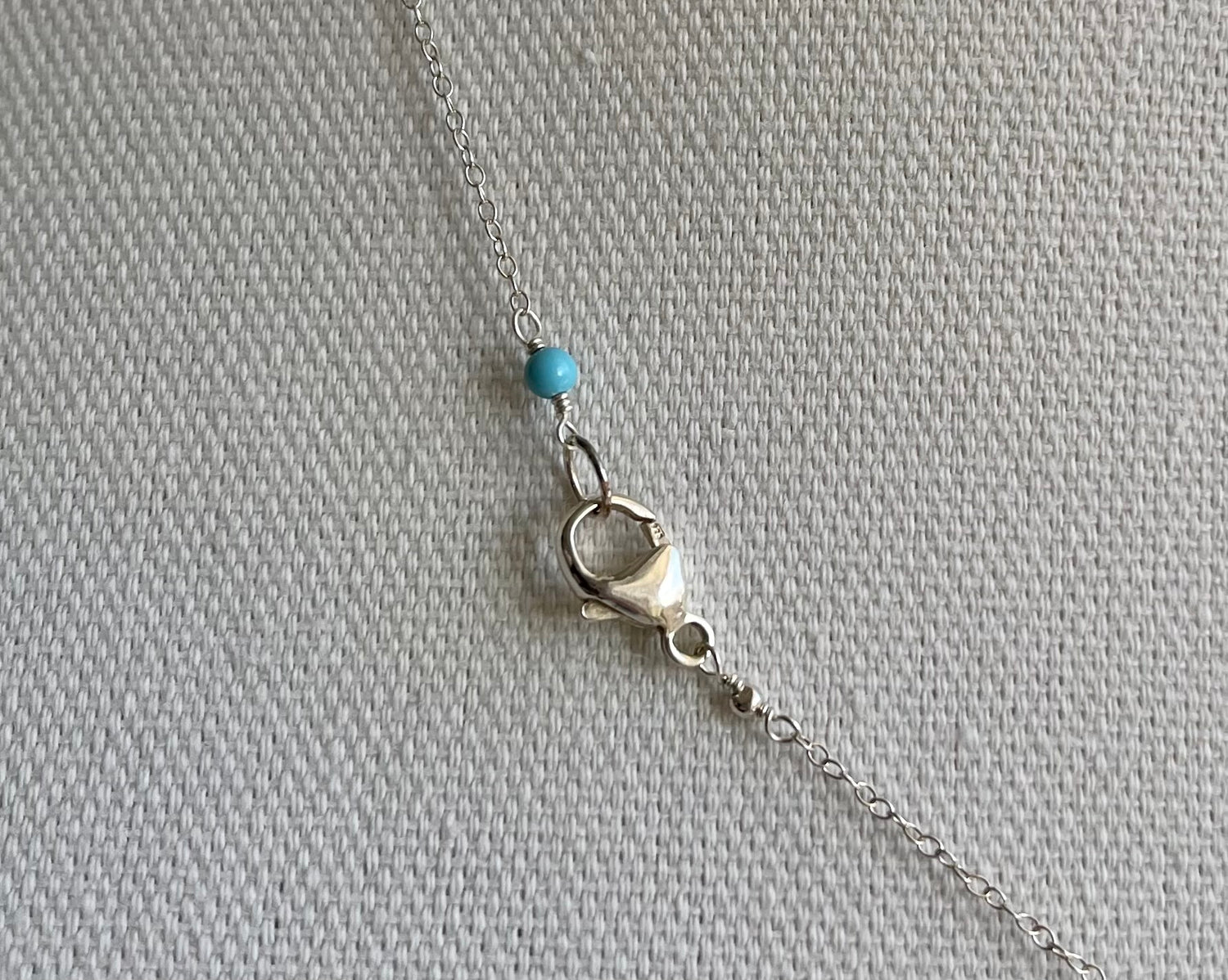 A collection of small charms—faceted carnelian, Thai silver, and a sky-blue Sleeping Beauty turquoise briolette—are wrapped with sterling silver wire to a small hoop. Pendant hangs from a delicate sterling silver chain. Necklace closes with a sterling silver lobster clasp, accented by a small turquoise bead. (The Sleeping Beauty turquoise mine closed in 2012, making its turquoise all the more valuable.)
