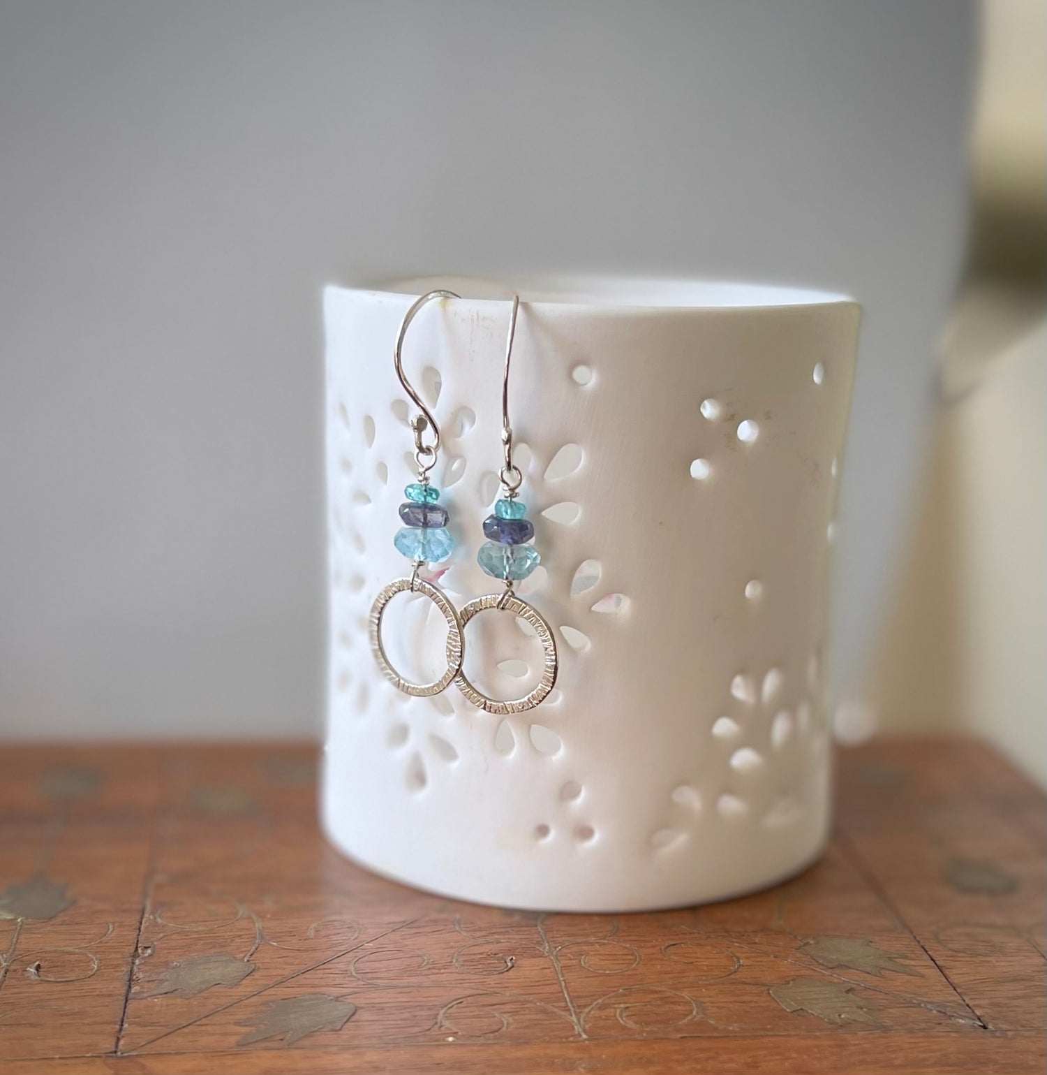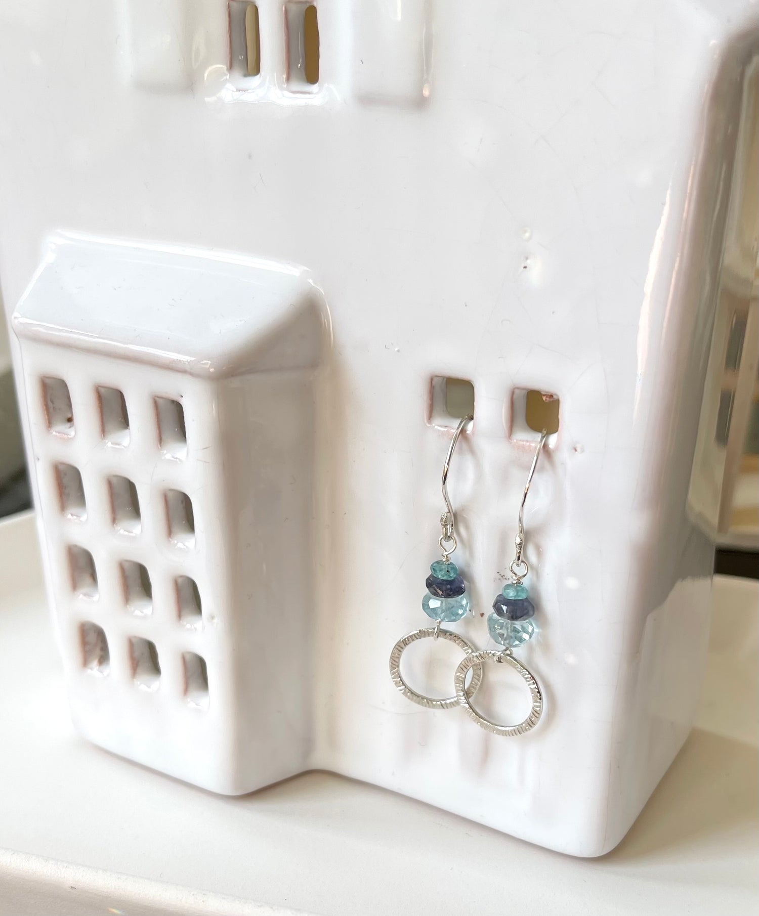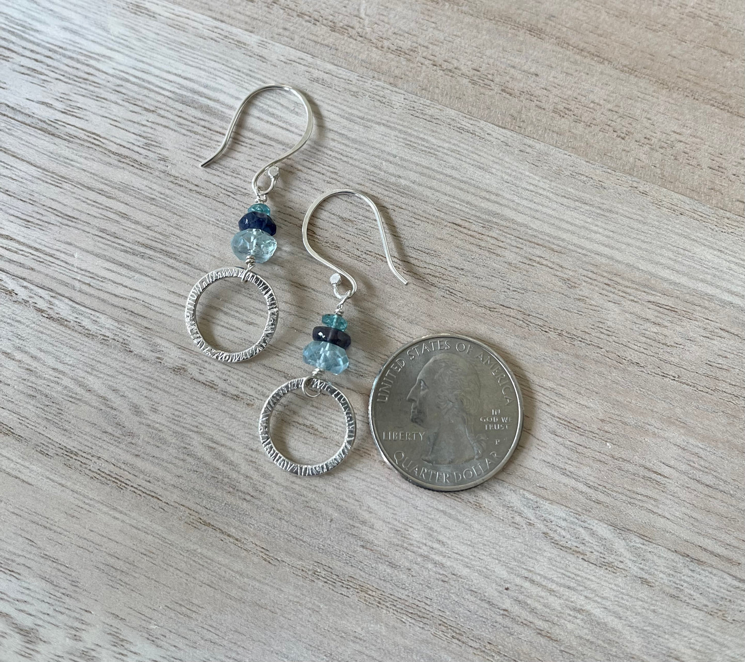 Textured sterling hoops swing beneath a stack of sparkling blue gemstones—pale blue aquamarine, navy iolite, and teal apatite. Earrings hang from handmade sterling silver earwires.