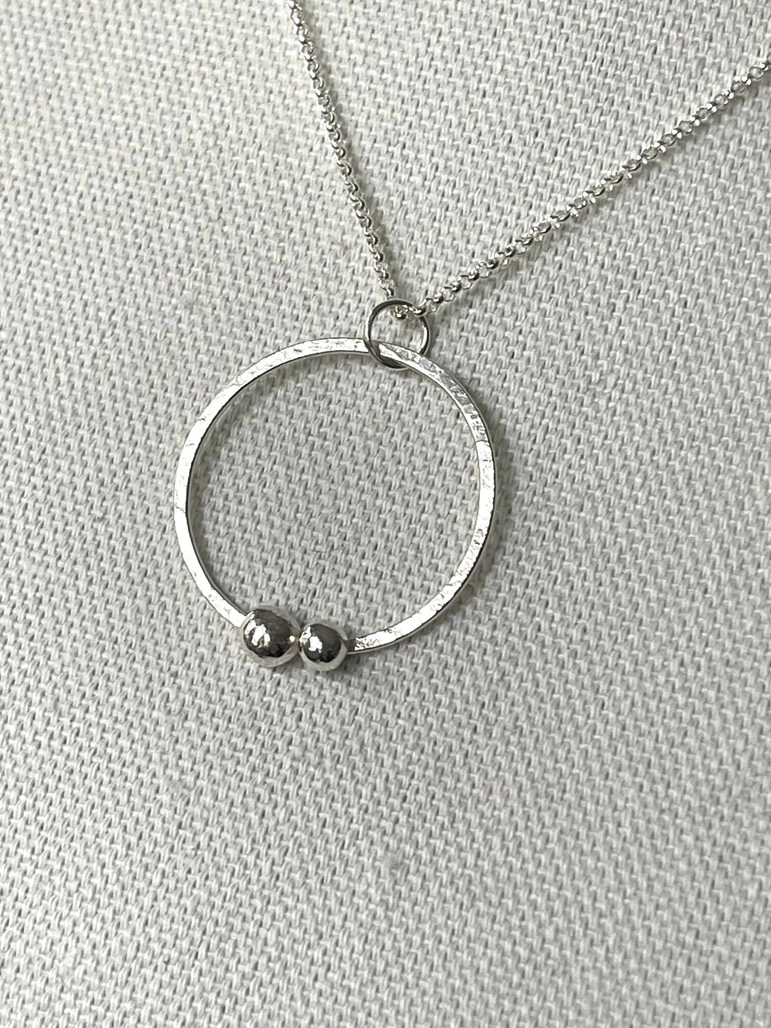 This striking pendant is made of a handmade, hammered sterling silver circle with two silver accent beads, which are made of recycled silver. Pendant hangs from a delicate sterling silver rolo chain. Closes with a handmade sterling silver hook clasp, accented by faceted tanzanite and iolite.