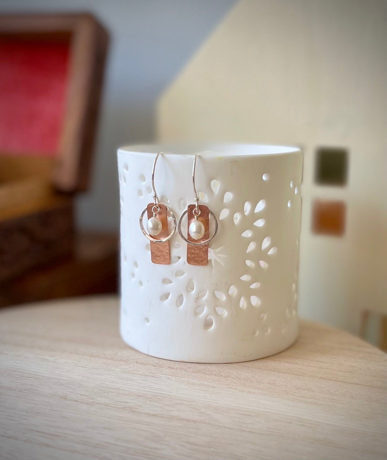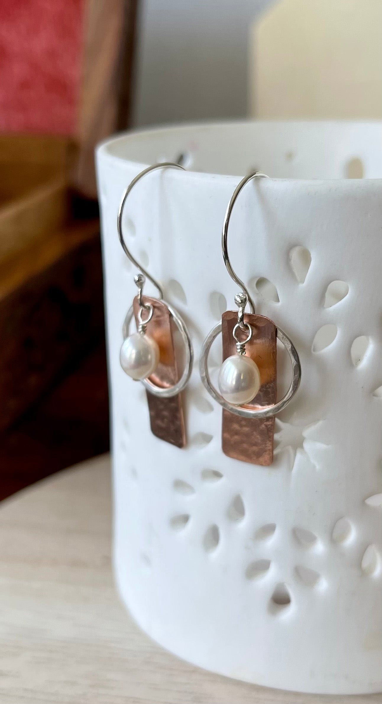 A playful mix of metals and textures combine in these playful earrings—hammered copper, sterling silver hoops, and shimmering freshwater pearls. Earrings hang from handmade sterling silver earwires.