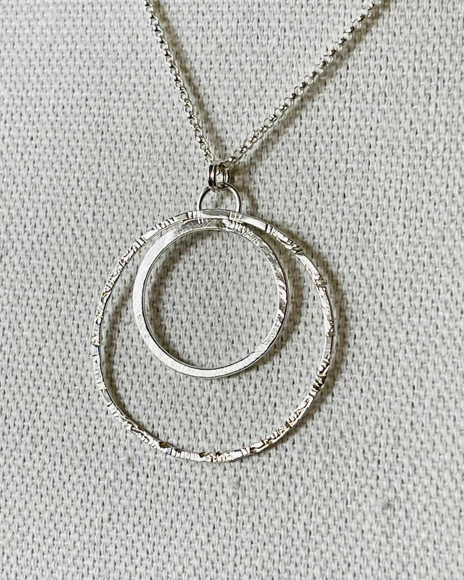 Two differently textured circles combine in this lightweight statement necklace. Pendant hangs from a delicate sterling silver rolo chain. Closes with a sterling silver lobster clasp, accented by faceted amethyst and tanzanite.