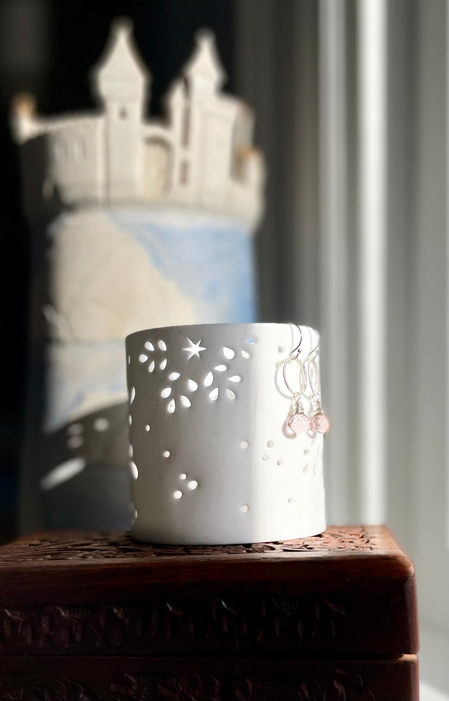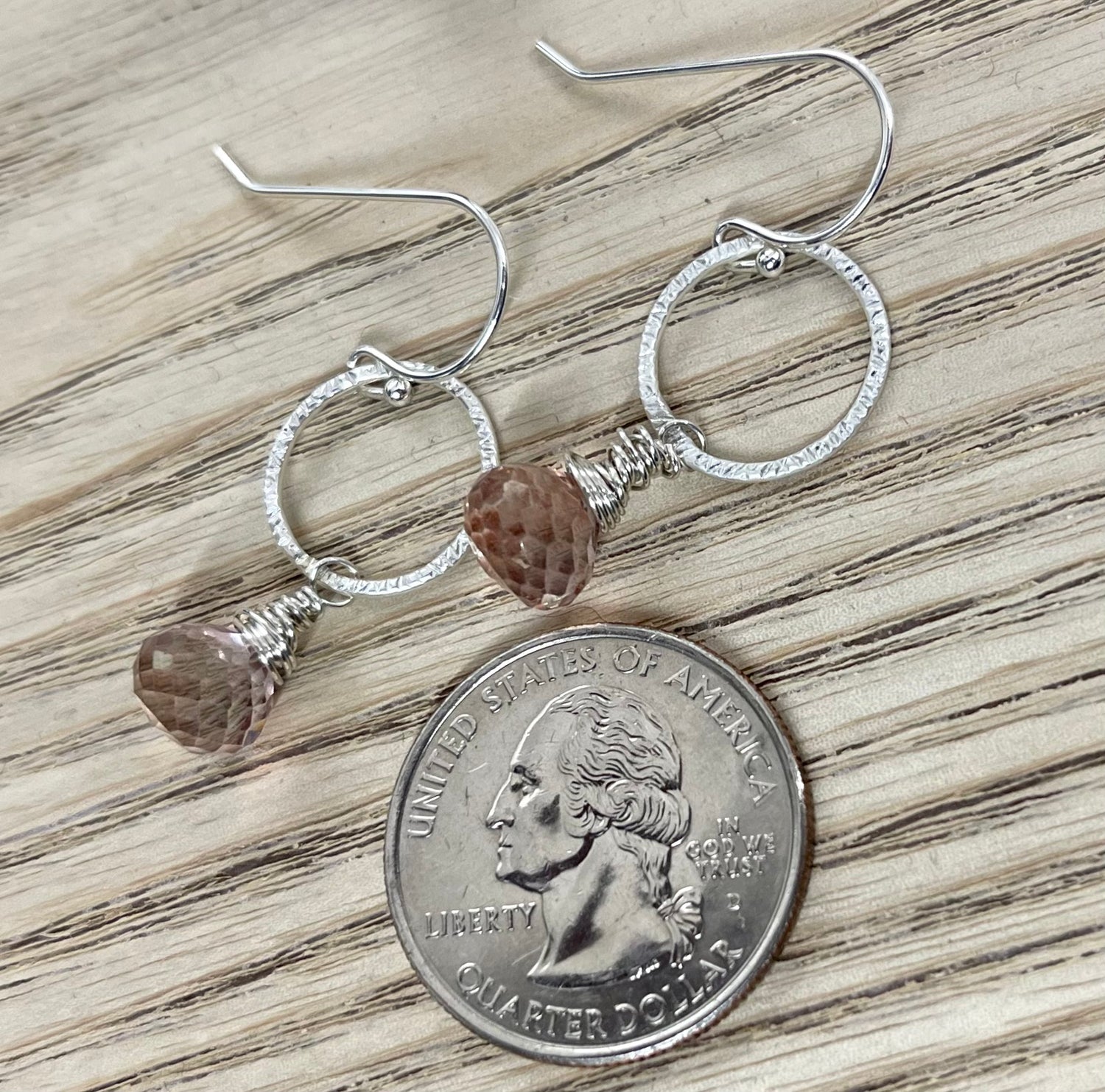 Dusty pink, faceted topaz drops are wrapped with sterling silver wire onto hand-forged and textured sterling hoops. These earrings hang from sterling silver earwires.