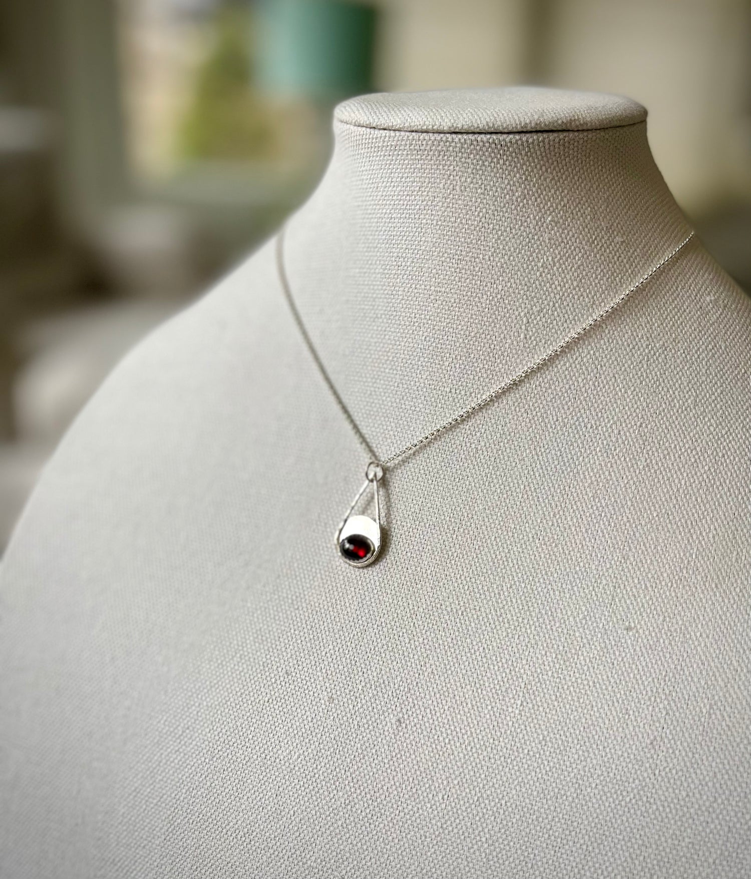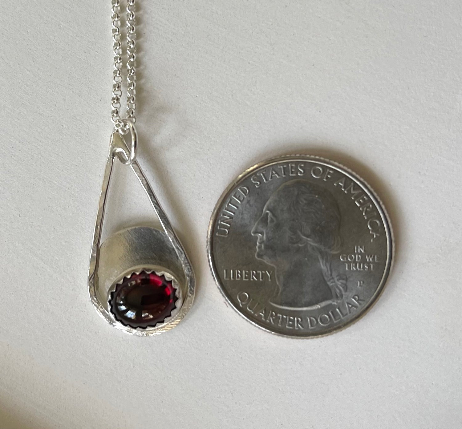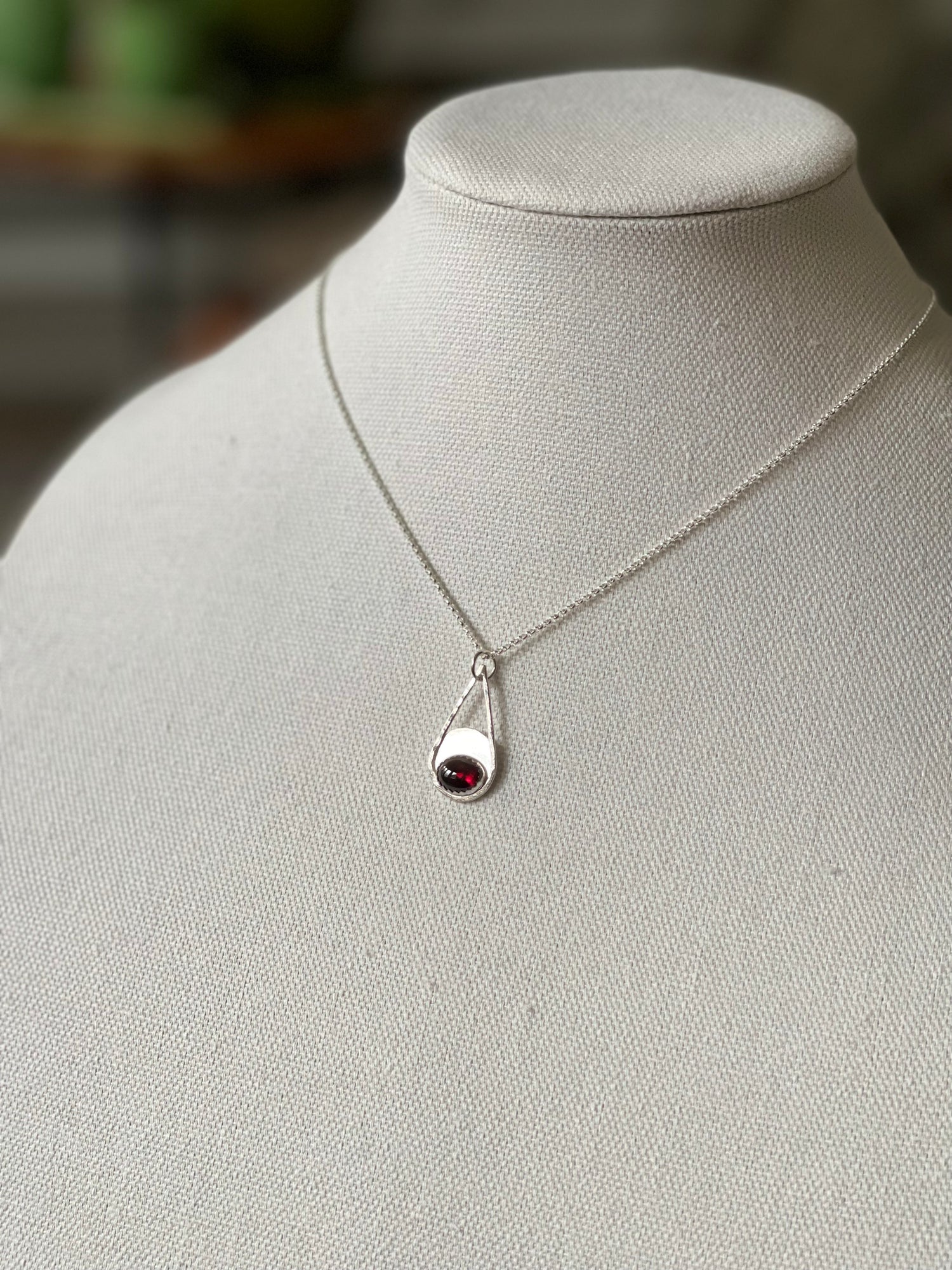 A luscious wine-hued garnet is set in fine and sterling silver, on a hand-fabricated pear-shaped pendant. Pendant hangs from a sterling silver rolo chain, and closes with a sterling lobster clasp, accented with two more garnets.