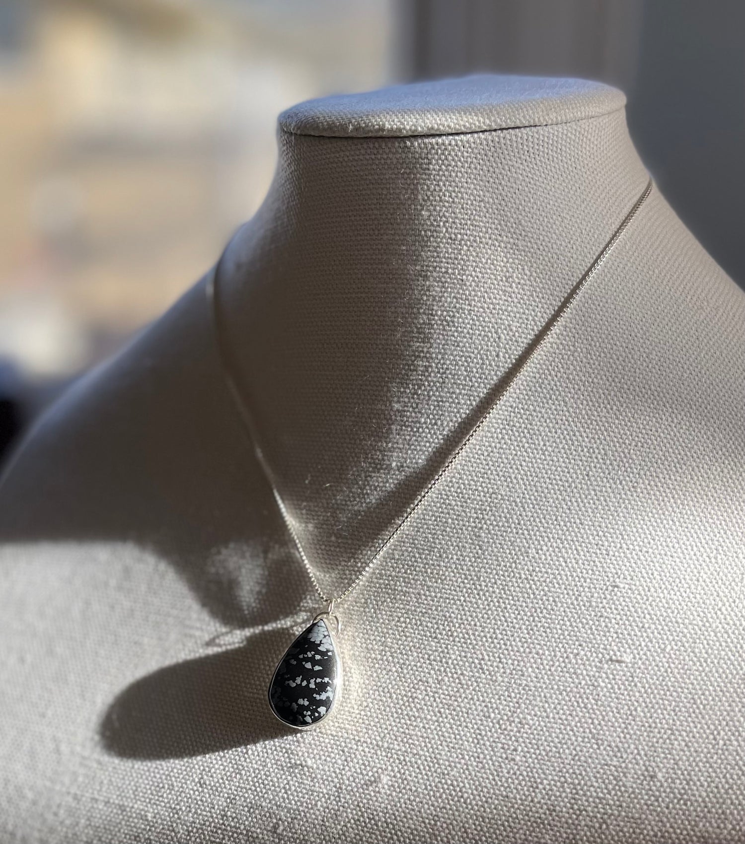 Snowflake obsidian set in a fine silver and sterling silver bezel. The pendant hangs from a sterling silver box chain. Closes with an adjustable handmade sterling silver hook and eye clasp with accents of faceted onyx and a Bali silver bead.