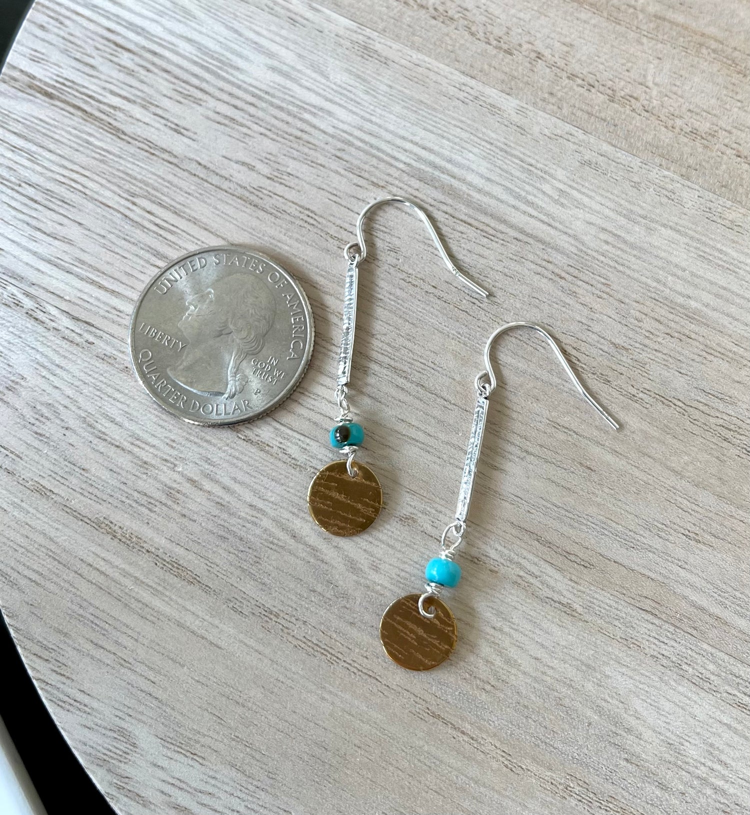 Hammer-textured sterling silver bars combine with textured brass disks and sky-blue turquoise. Sterling silver earwires.